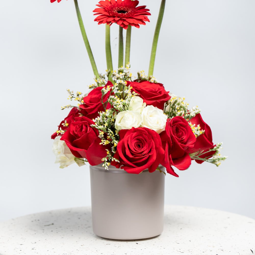 The Red Roses & White Baby Rose in Pot – 40 cm Height is a refined floral arrangement that captures timeless romance through balance and contrast. Featuring velvety red roses paired with delicate white baby roses, this composition reflects elegance, tenderness, and thoughtful design. Handcrafted by Plaza Hollandi UAE for clients in Abu Dhabi, it is arranged in a tasteful pot, making it a graceful floral statement ready for display.