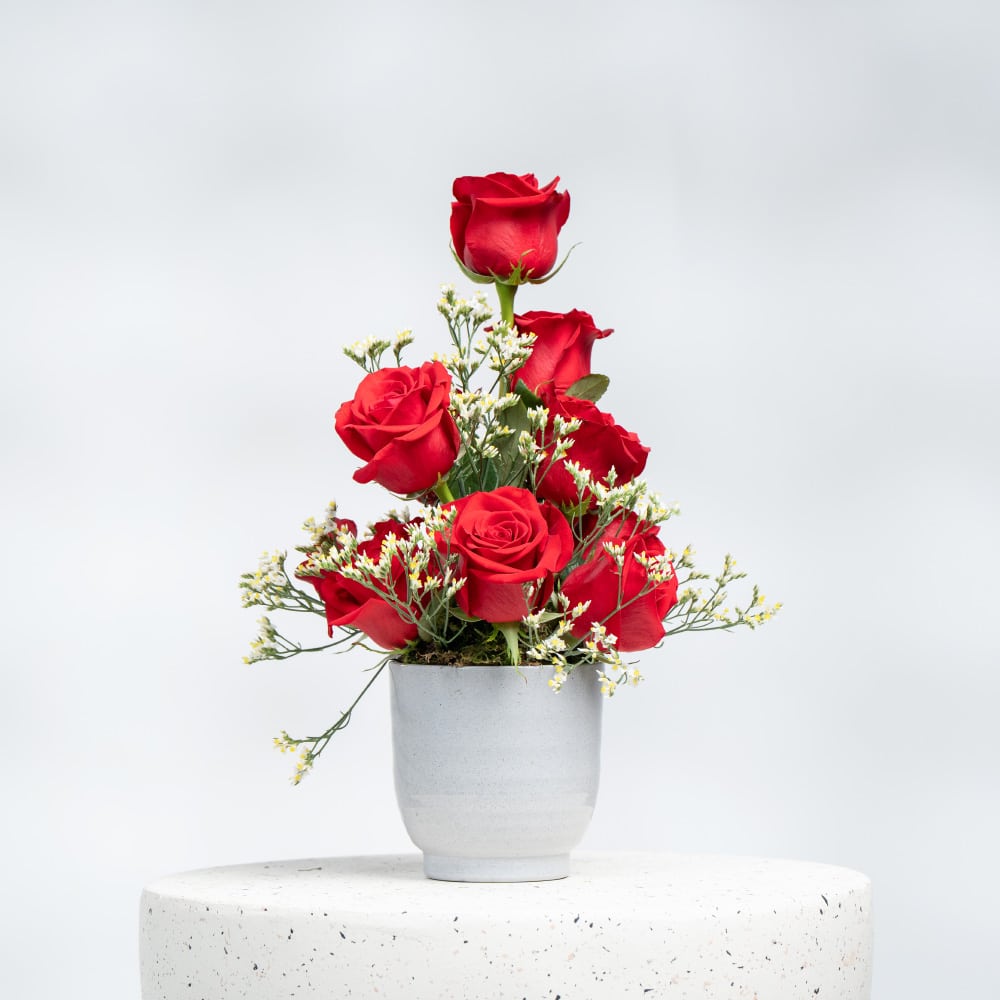 The Red Roses & White Limonium Bouquet in Pot (40 cm Height) is a beautiful balance of romance and elegance. Explore this arrangement and more premium floral creations by visiting our locations and enjoy luxury flower delivery in Abu Dhabi with Plaza Hollandi UAE.