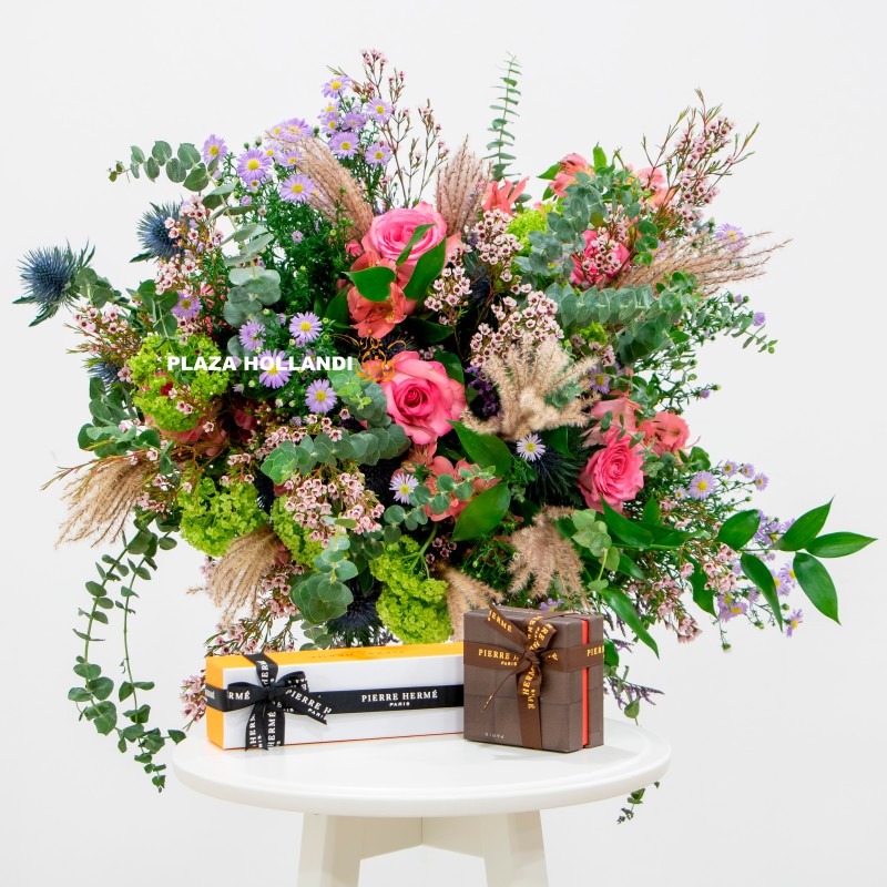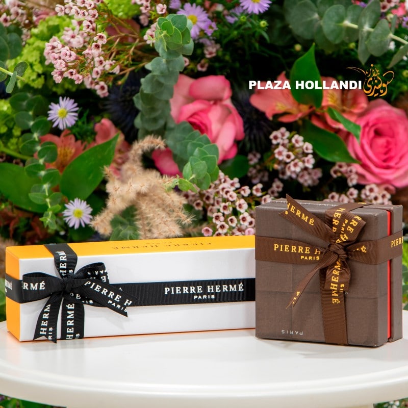 This combined gift of fresh flowers together with delicious sweet treats from Pierre Hermé are only available online at Plaza Hollandi. Voted ‘Best Pastry Chef in the World’ in 2016 and nominated the 4th most influential French personality in the world in the same year by Vanity Fair magazine, Pierre Hermé creates his own tastes and flavour combinations, just like an artist. A gift that will be remembered as a thoughtful idea to give as well as to receive.   A beautiful flower and chocolate combination.