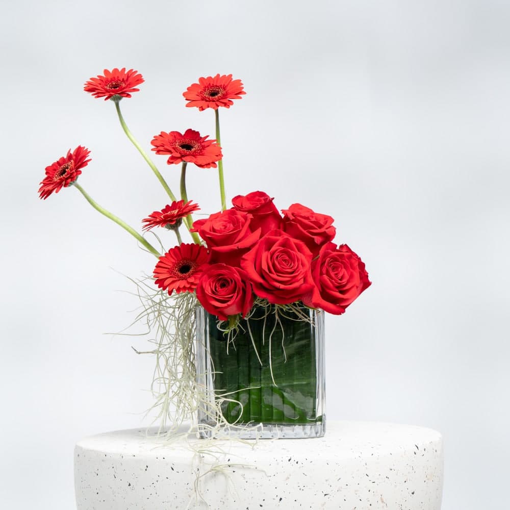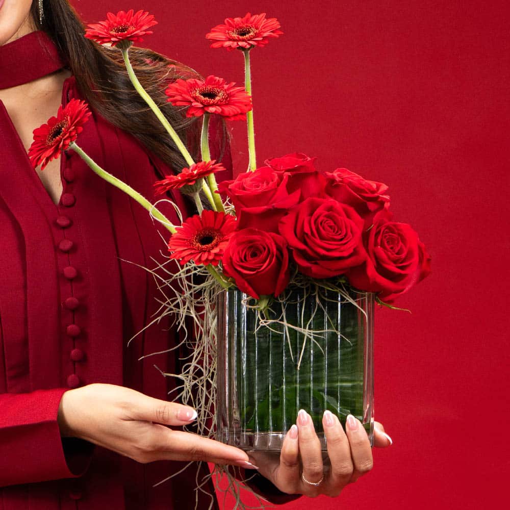 The Red Roses & Gerbera Flowers Romantic Arrangement in Glass Vase (35 cm) is a perfect blend of elegance and emotion. Discover this arrangement and more premium floral designs by visiting our locations and enjoy luxury flower delivery in Abu Dhabi with Plaza Hollandi UAE.