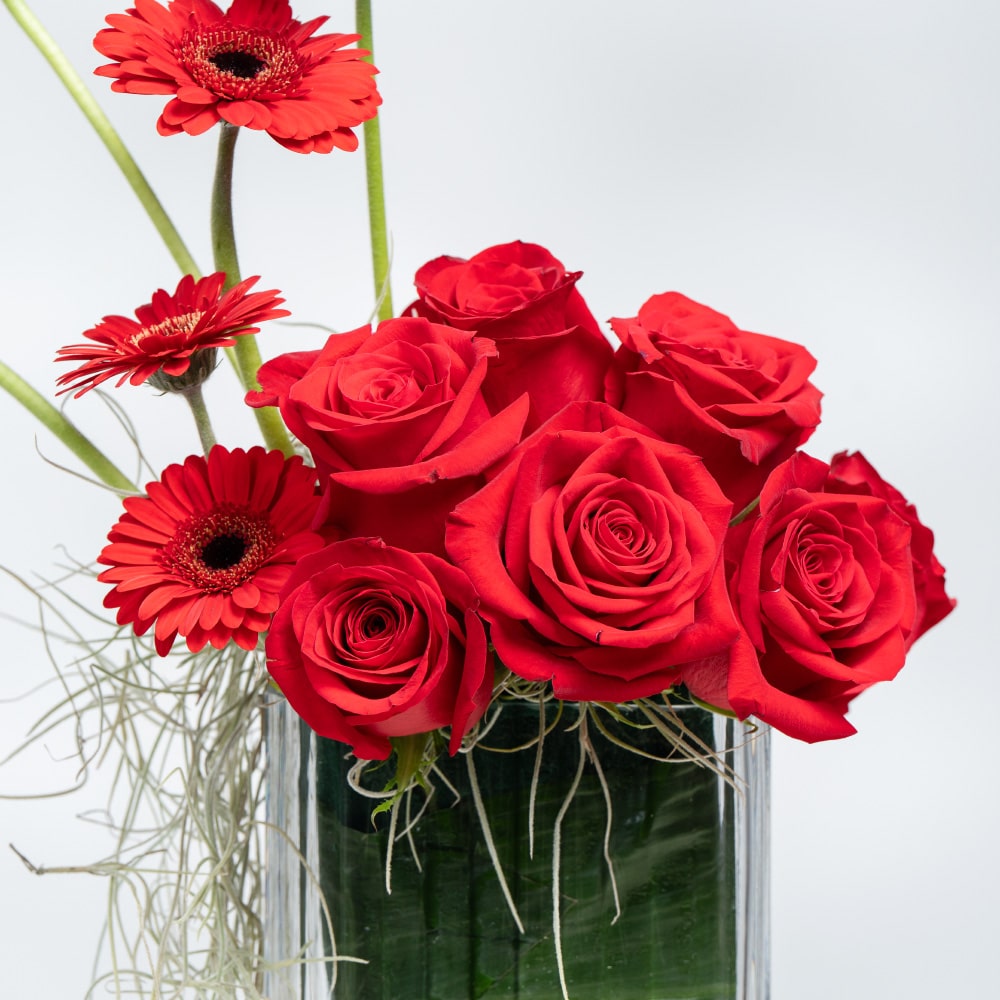 Romantic Red Roses & Gerbera Flowers in Glass Vase (35 cm)
