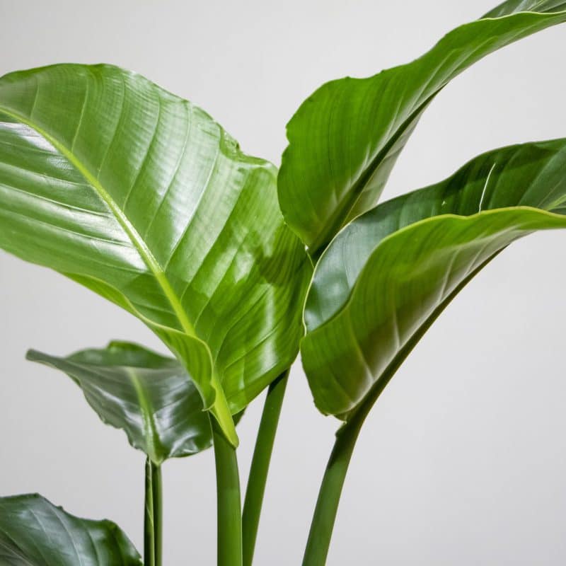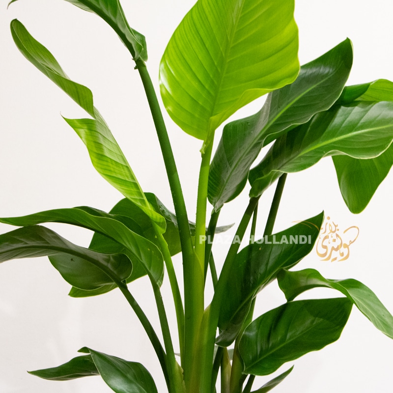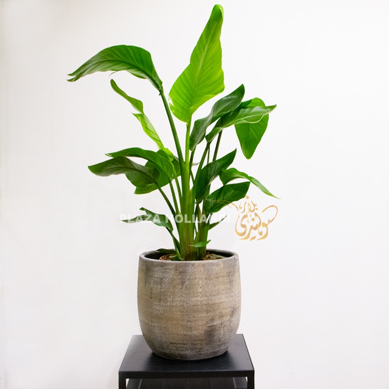 A stunning Strelitzia plant, also known as a Bird of Paradise planted in a textured silver pot. Birds of Paradise enjoy moist (but not soggy) soil, and being allowed to dry out slightly between watering. This beautiful plant is currently very popular and considered the Queen of the indoor plants. Added to bedroom designs, living room designs and also bathrooms the Strelitzia plant. It is best to water this plant with filtered water to avoid browning of the edges of the leaves due to the chemicals in tap water.