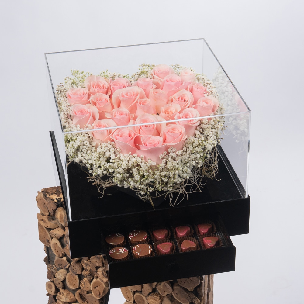 This delightful arrangement features pink roses and gypsophila, beautifully combined to create a soft and elegant floral display. Accompanied by a box of Plaza Hollandi Premium Chocolate, it makes for a perfect gift or centerpiece.