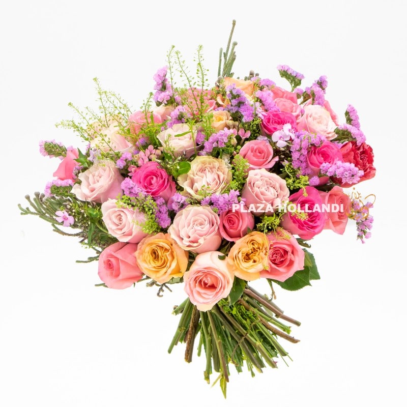 A beautiful vibrant flower bouquet of purple, pink and peach rose with purple statice, green bell and brunia.  This beautiful bouquet is bright and stunning and would suit any interior with a natural tone.  Perfect for a birthday, to welcome someone home, or just because.