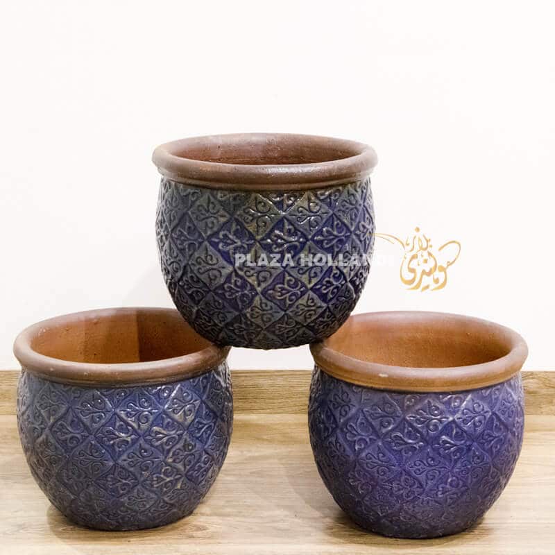 Three blue plant pots with holes in the base. They can be used for indoor plants or for outdoor plants. Each pot is approximately 40cm wide and 40cm tall. Great sturdy pots that will add colour in your garden or home.