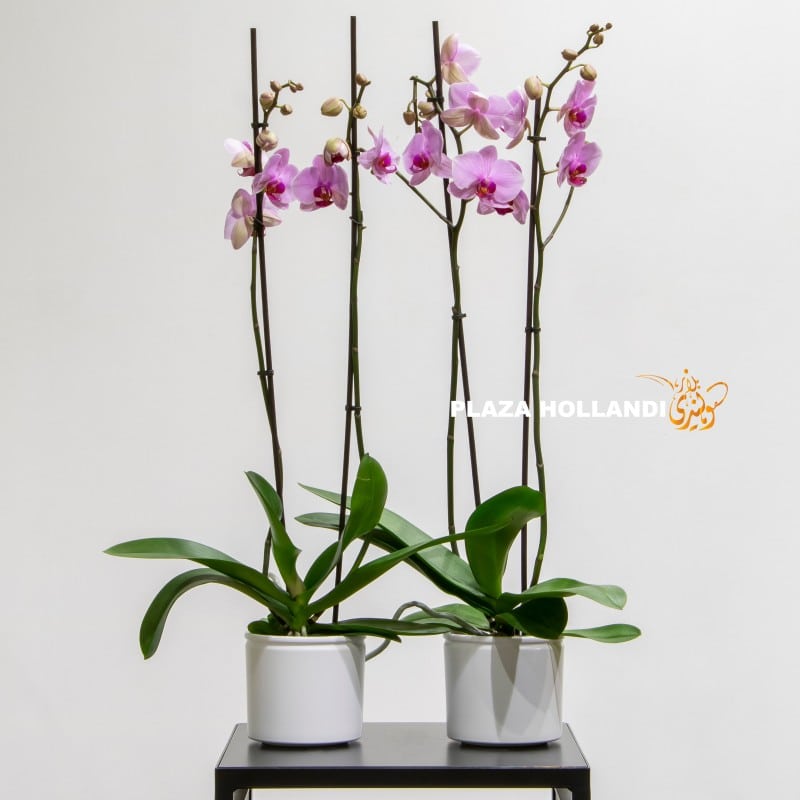 Two beautiful pink phalaenopsis orchids planted in white pots.  A beautiful orchid gift for your home or to send as a gift.  These long lasting orchids are a beautiful addition to any home interior and are easy to look after.