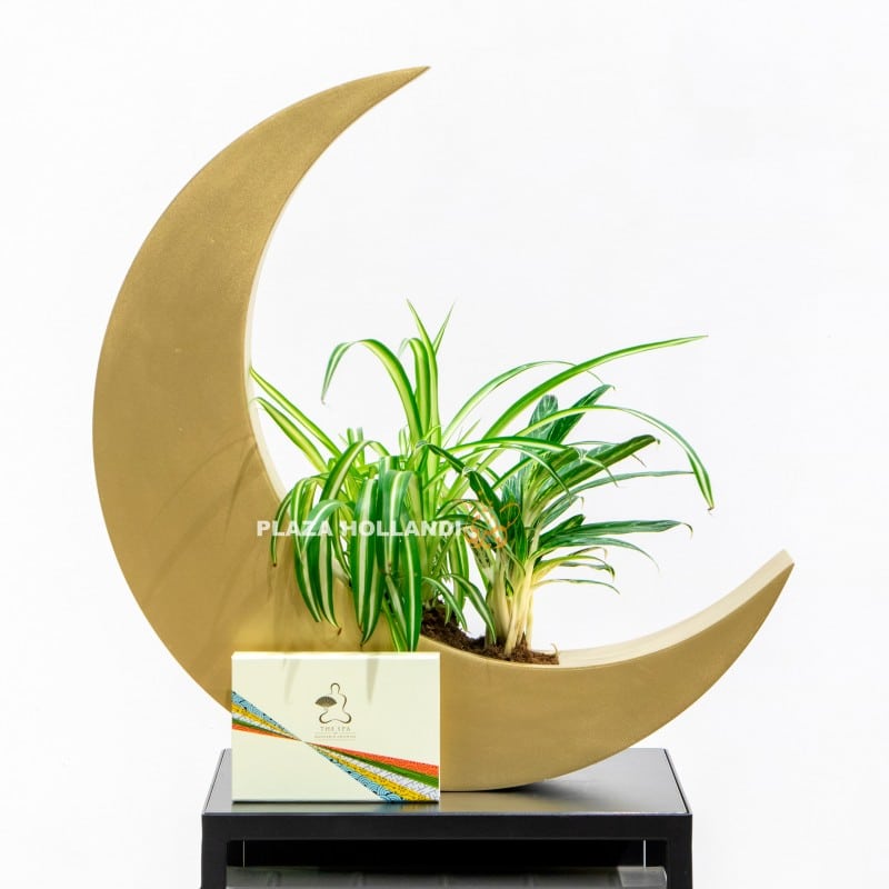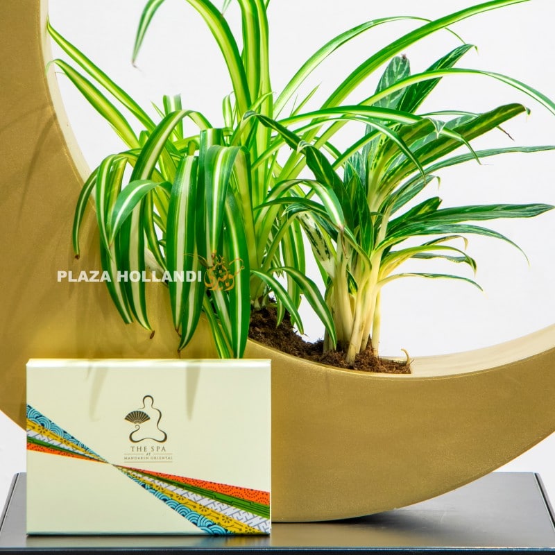 A beautiful wooden handmade gold crescent moon with indoor plants and a QAR1200 spa voucher for The Mandarin Oriental Spa.