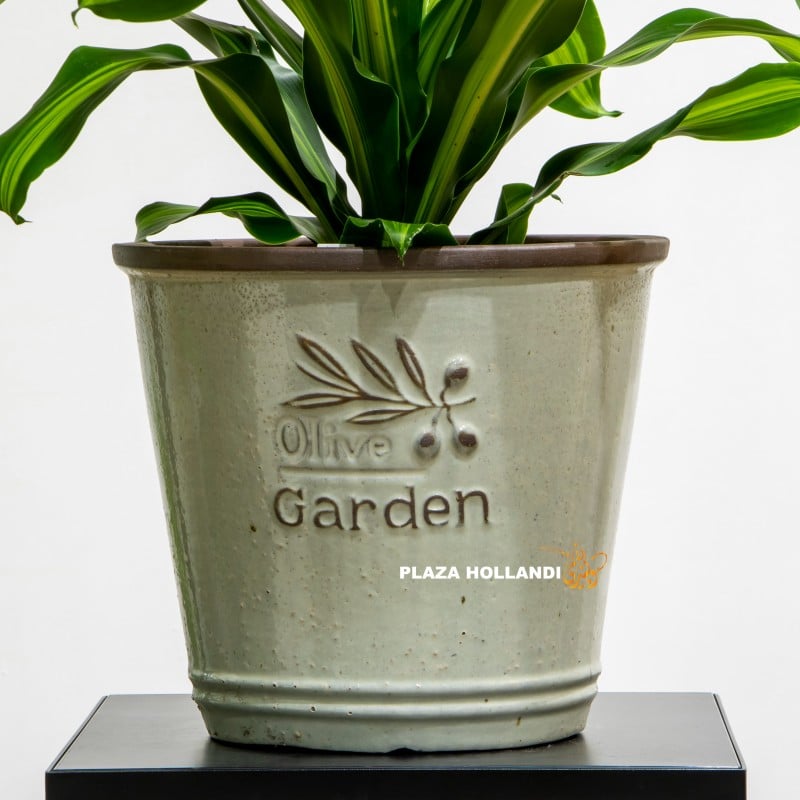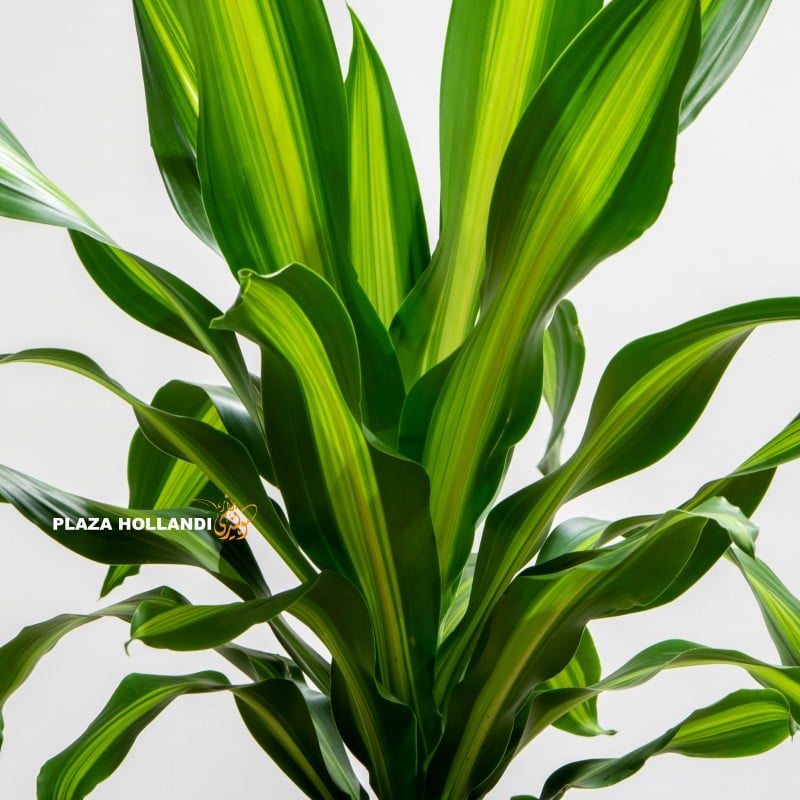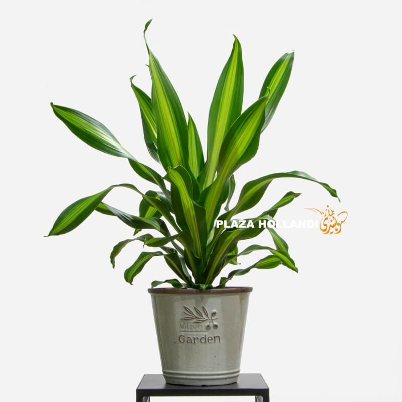 A beautiful variegated Dracaena plant in a European style pot. This plant is famous for its luscious foliage and its low maintenance growth. It is the most loved variety in the Dracaena family.