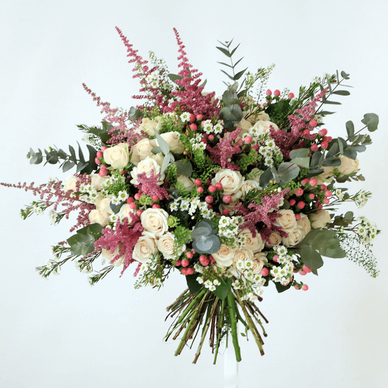 A vibrant vintage style bouquet designed by using spray roses, wax flower, astilbe, statice and mixed greenery.