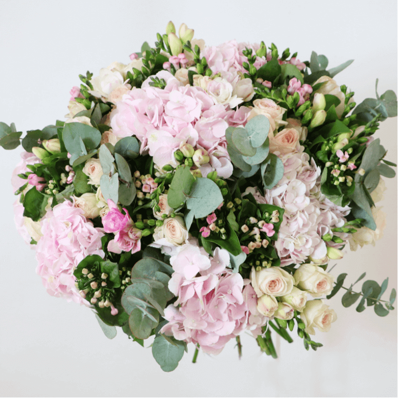 A classic arrangement bursting with beautiful full hydrangeas mixed with roses, bouvardia, spray rose and eucalyptus. A beautiful bouquet to have in your home.