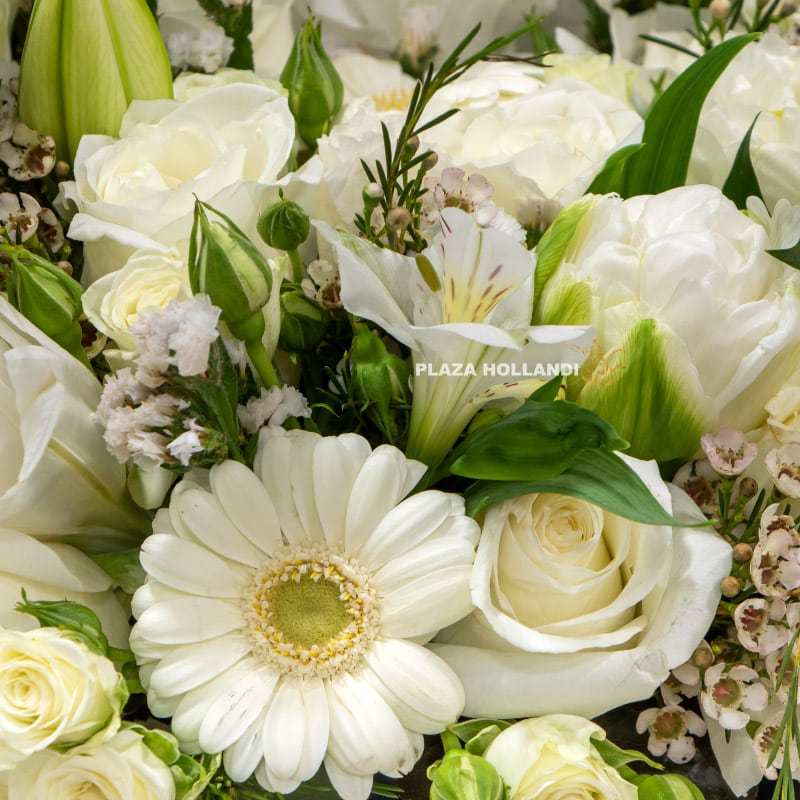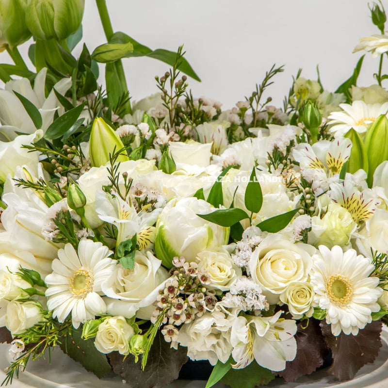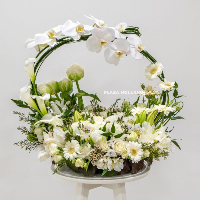 A beautiful white and green flower design that is ideal to send for any occasion. This unique flower design is filled with white flowers and a touch of foliage. We have designed this arrangement with white gerberas, white roses, white eustoma, alstroemeria, white tulips and calla lilies, with a beautiful stem of white phalaenopsis orchids attached to a salex arch. Filled with flowers this classic and elegant design is perfect to send to wish someone a happy birthday, as a welcome home gift and even for a new baby.