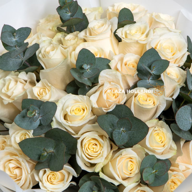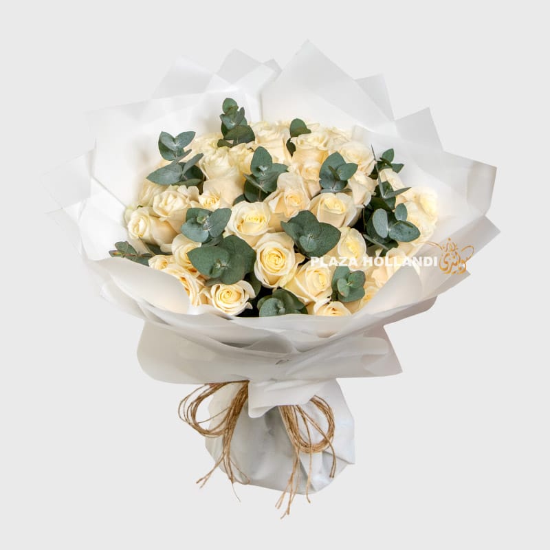 Bring a touch of classic beauty and natural serenity to any occasion with the White Rose & Eucalyptus Bouquet from Plaza Hollandi. This timeless combination of pristine white roses and fragrant eucalyptus creates a sophisticated and refreshing arrangement.