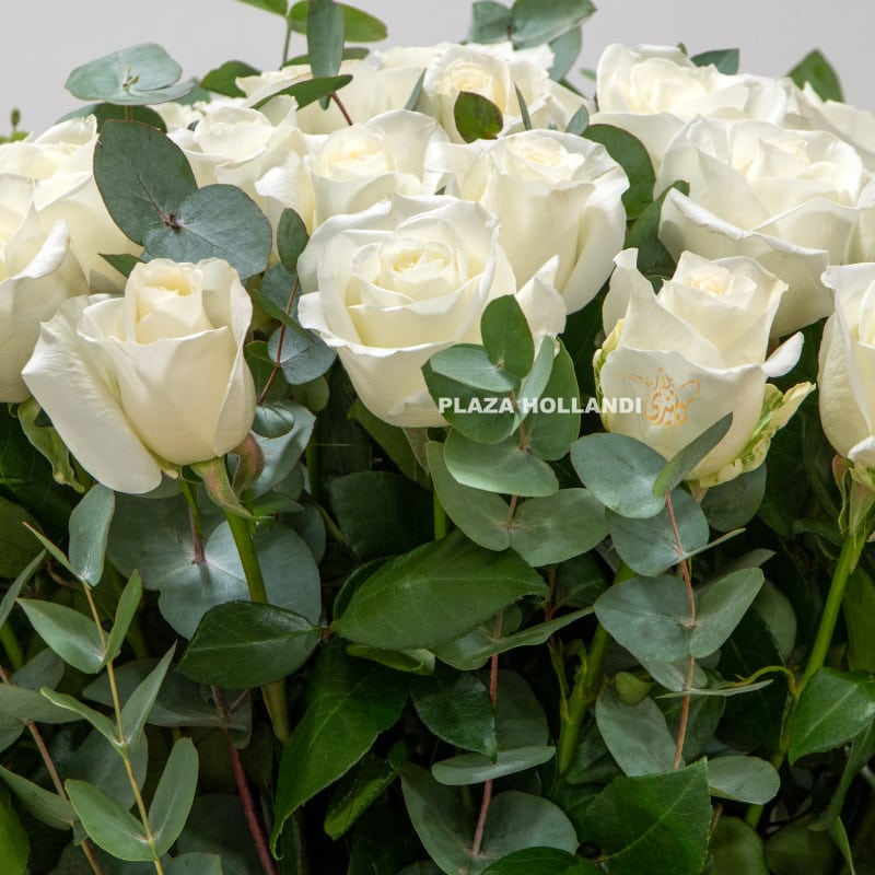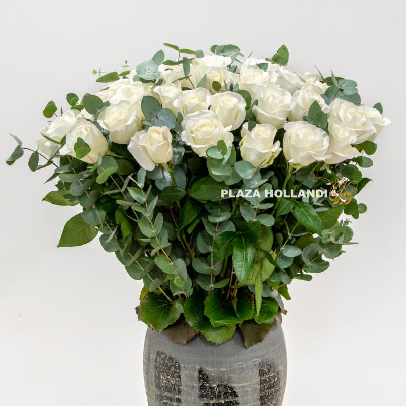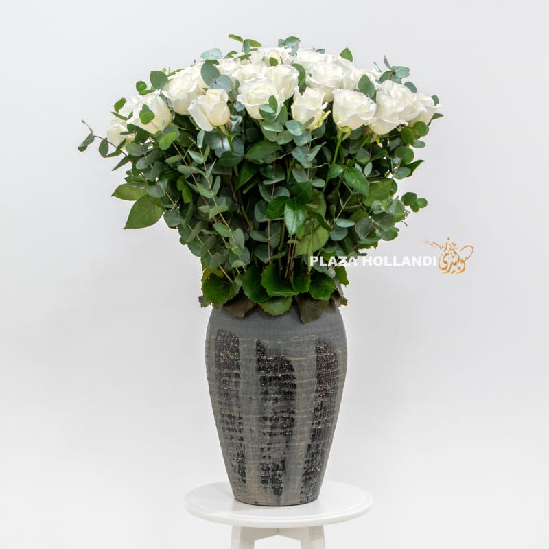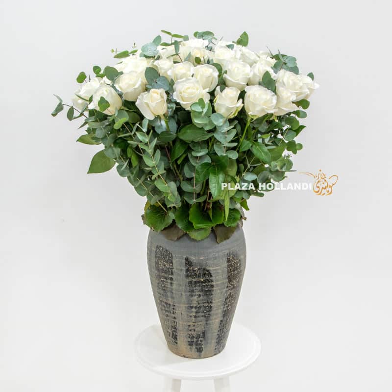 Beautiful white roses with scented eucalyptus arranged in a handmade ceramic pot. This design will add a touch of sophistication to any occasion.