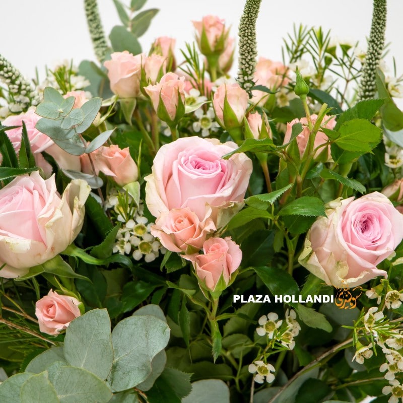 • pink rose, eucalyptus, in a plaza hollandi box