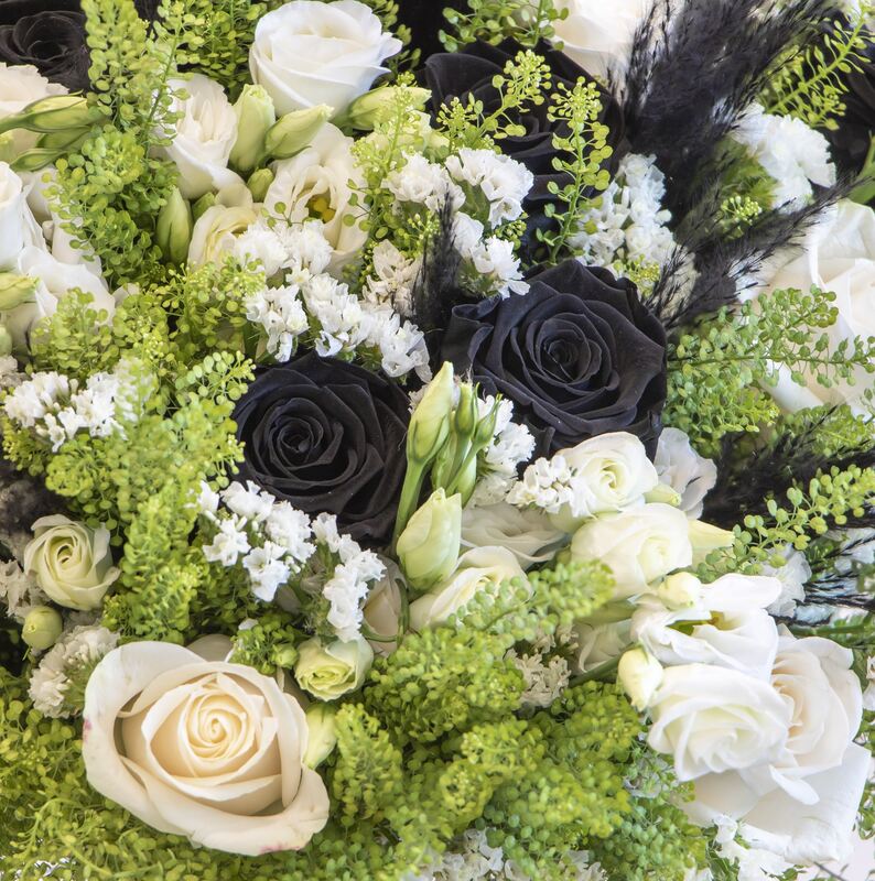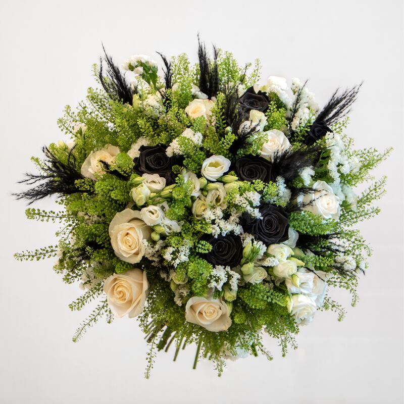 A beautiful bouquet of long lasting Rose Amor black roses, surrounded by spray roses, eustoma, statice, green bell, black pampas grass and cream roses. Order before 5 pm for same day delivery.