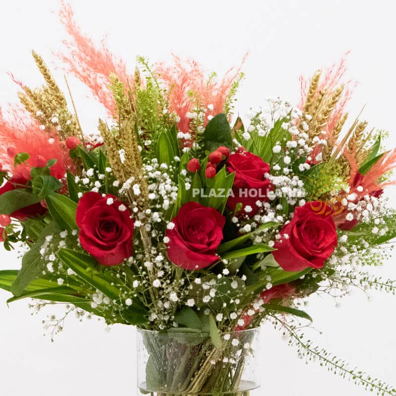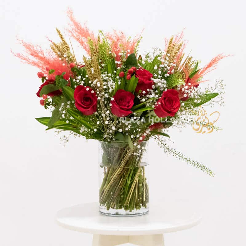 A stunning bouquet of red pampas grass with red large headed roses, dried wheat, red hypericum and gypsophelia all arranged in a glass vase. This bouquet would be perfect for a romantic occasion or to have at home to add colour to your house. Order yours today before 5 pm and we will deliver it for you.